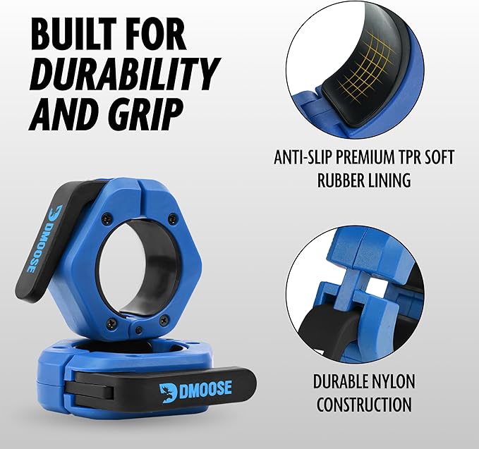- 𝐃𝐔𝐑𝐀𝐁𝐋𝐄 𝐂𝐎𝐍𝐒𝐓𝐑𝐔𝐂𝐓𝐈𝐎𝐍 𝐖𝐈𝐓𝐇 𝐀𝐍𝐓𝐈-𝐒𝐋𝐈𝐏 𝐆𝐑𝐈𝐏: Built for durability and reliability, DMoose Barbell Collar is constructed with high-quality nylon polyamide and premium TPR soft rubber lining. The anti-slip grip of the Barbell Clamp ensures your weights stay in place, providing a safe and effective lifting experience. Trust in the robust build to withstand the toughest workouts and last for years, delivering consistent performance.