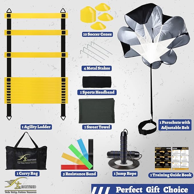 • EFFICIENT CHOICE: The Football Training Equipment Includes 1 Agility Ladder(20ft long 12 rungs) with 1 Running Parachute, 10 Cones, 4 Fixable Stakes, 1 Jump Rope, 5 Resistance Bands, 1 Sports Headband, 1 Sweat Towel, 1 Training Guide Book and 1 Carry Bag