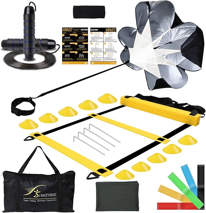 • A MUST-HAVE FOOTBALL TRAINING EQUIPMENT SET: EAZY2HD Soccer Training Equipment for Kids Will Improve Balance, Agility, Speed, Reflexes, Footwork, Coordination, and Explosiveness with this Professional Grade Agility Training Equipment. Achieve New Levels Of Agility And Speed With Fast Footwork Circuits And Plyometric Movements