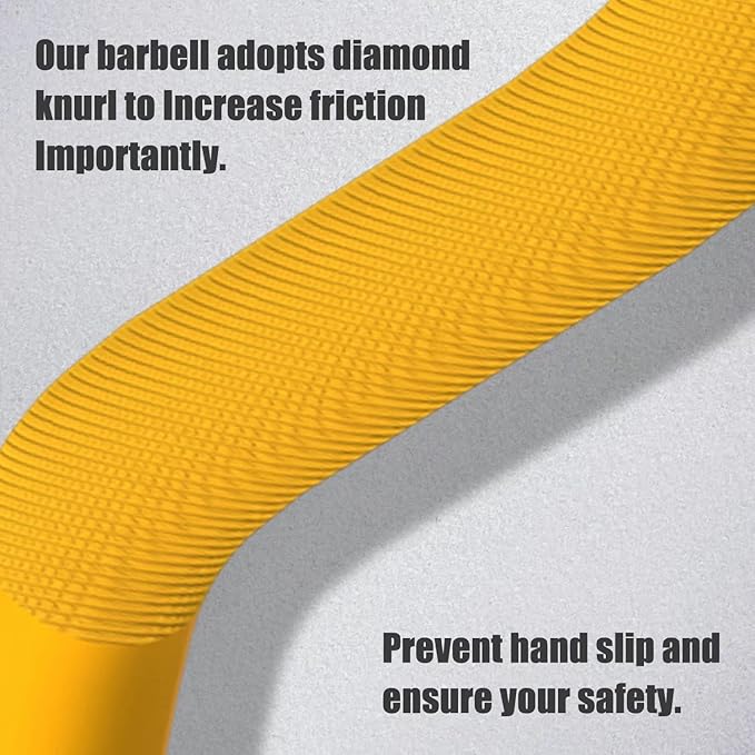 • 【KNURLED HANDLES】This Olympic barbell adopts diamond knurl for improving grip. These knurls with a 1.2mm medium-level knurling, increase friction, And it can increase the safety and ensure comfort when you exercises.