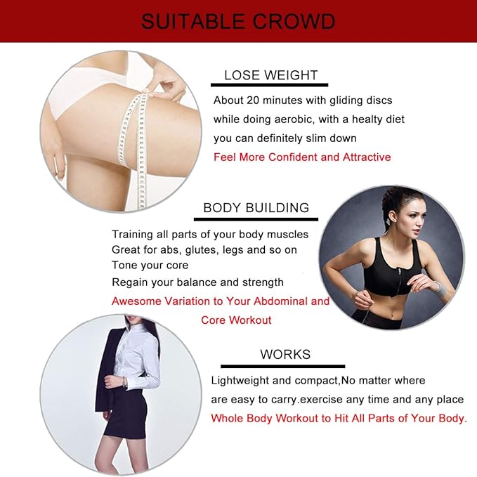 - ★【Multi-Functional Training】With such a wide variety of slider exercise to do, our fitness sliders are the perfect piece of equipment for defining your abs! If you want to cut off belly fat to give your legs, arms and stomach muscles more strength, move up and start an aerobic workout with these sliders, you deserve to feel great and have a healthy lean physique. Awesome Variation to Your Abdominal/Core Workout.