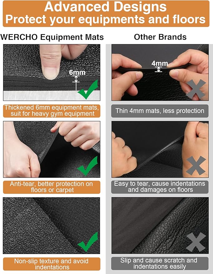 • Non-slip and Waterproof Exercise Equipment Mat: This durable PVC equipment mats can be quickly and easily installed directly over your existing carpet or floor. It has a non-slip design that fits tightly without separating over time - even when bearing the weight of heavy workout machines. Plus, WERCHO home gym mats are able to prevent sweat as well as accidental water spills from reaching the floor. The water-resistant exercise equipment floor mat is also very easy to clean using a damp cloth.