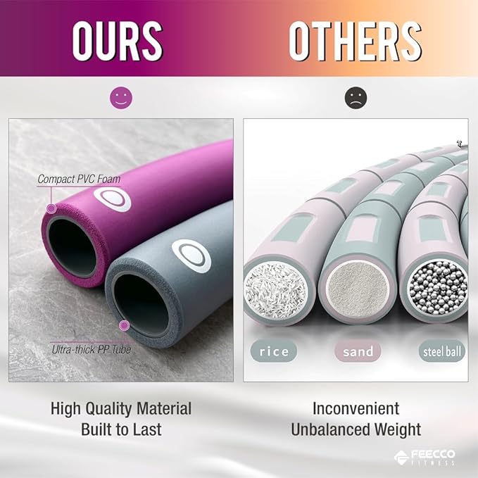 - Tear Resistant and Extra Comfortable - If you have experience with a bad hoop that kills your stomach, or tears out easily, now you’ve got the solution. Our exercise hoops are built with high density foam that gives you better padding when the hoop goes around your waist, so it’s less pain at your workout, and it’s more resistant against damages.