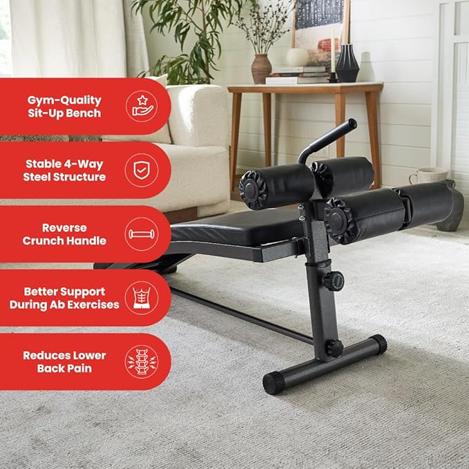 • Unique Design – high strength 4-way frame adds stability to this sit up bench for abs. No wobbling or shaking like most sit up exercise equipment. Strongly designed for your toughest ab workout.