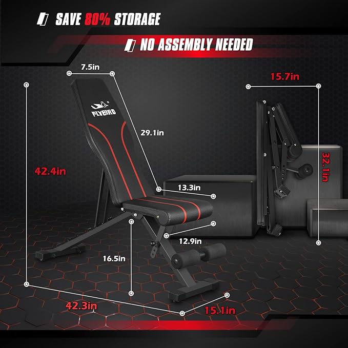 • Save 80% Space: FLYBIRD foldable bench, easy to carry & NO ASSEMBLY NEEDED, folded size: 31.5" L x 12.6" W x 11.8" H; You can put it in the corner, closet, or under the Bed when you finish workout