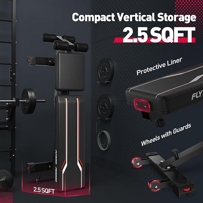 - Compact Vertical Storage: The space-saving design allows the bench to be stored in an upright position separately, only taking up 2.5SQFT of space; Thanks to the integrated wheels and handle, it can be moved around easily with minimal effort; A protective plastic liner on the end of the back pad protects the cushion from being frayed