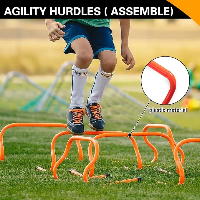 - 【Football Training Equipment Set】Includes 1 yellow speed training ladder (20 feet long, 12 rungs) with 4 steel spikes, 12 disc cones, 4 agility hurdles,1 running parachute, 1 jump rope, 1 carrying bag. It can meet your training requirements for a healthier life.