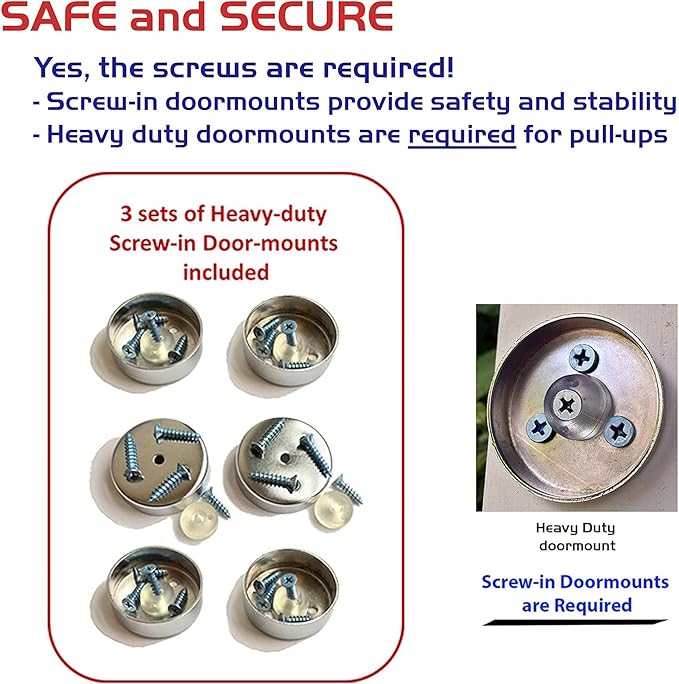 - Screw-In Door Mounts for Safety: Heavy-duty chrome steel pull-up bar and door mounts provide great support and safety - Holds up to 330 lbs (150kg) when properly mounted using supplied screw-in door brackets. Note: Always use the provided screw-in door mounts and the locking screws
