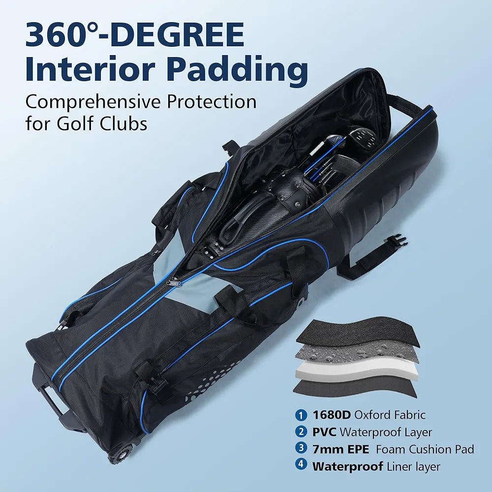 - Maximum Protection - The Golf Travel Bag features a hard shell ABS top, a soft-sided 1680D ballistic nylon fabric body, and a thickened cushion layer, ensuring your golf clubs are protected from collisions and damage. Excellent waterproofing and durability protect your equipment from rain and moisture.