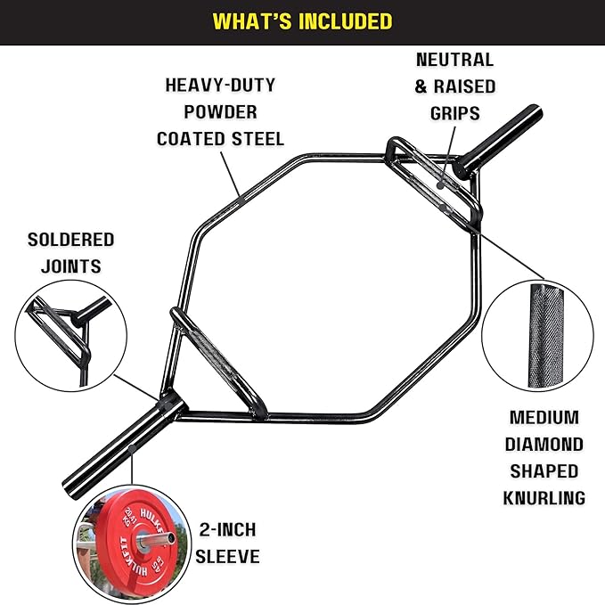 - Special features and compatibility: The closed hex bar design provides a more comfortable and natural grip compared to open trap bars, reducing stress on your lower back (better deadlift posture). Compared to traditional trap bars, these feature raised and neutral grips. The medium, diamond shaped knurling on the handles offers a secure, comfortable grip for both experienced lifters and beginners. This bar weighs the same as a traditional barbell (45 lb), so you can be sure it has the tensile strength to hold the weight securely and it will hold multiple 2-inch Olympic weight plates.