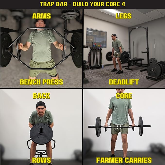 - Home gym exercise equipment targets multiple muscle groups: Perform a variety of exercises including deadlifts, squats, lunges, overhead presses, farmer carries, and more with this versatile trap bar. The deadlift bar is a one-stop shop that allows you to perform full-body workouts that target your “Core 4”, with exercise examples included: arms (bench press), legs (squats/deadlifts), back (rows), and core (farmer carries).