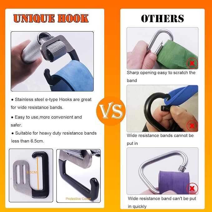 • Unique e type hook: Large e-type hook made of stainless steel. Unique shape is perfect for wide resistance bands and easy to hang or take off.
