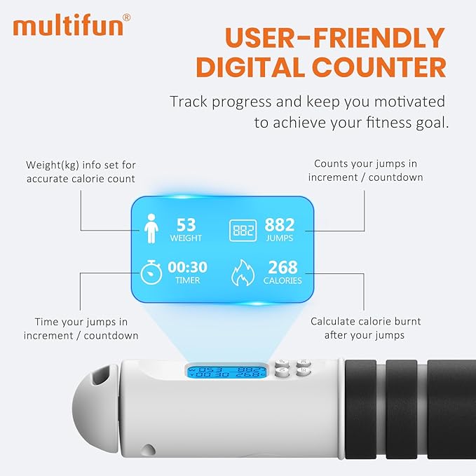 - 【Jump Rope with Counter】With HD LED display on this jump rope, which shows Timer, Weight(lb/kg), Calorie and Circles, Just set your information and it will show you the number of laps and calories.