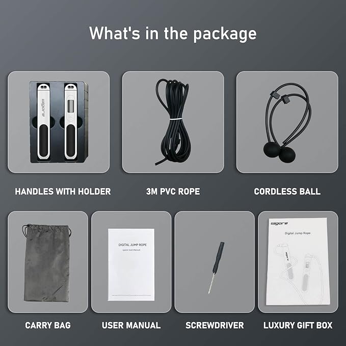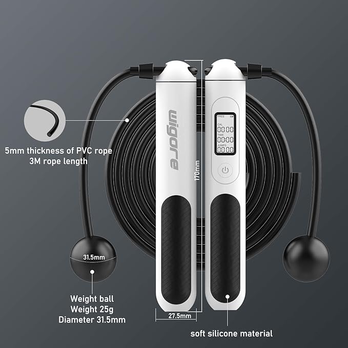 • 【LED HD Display & Ergonomic Handles】: Wigore jump rope are unique design for fitness are equipped with Ergonomic Handles that is made from friendly environmental ABS and non-polluting silicone material. ergonomic silica gel non-slip grip. Non-slip, non-toxic, and tasteless for safe use. The comfortable hand grip reduces fatigue and makes exerting force easie,Also,the main handle is embedded with a backlit LCD display that provides users a clear view of your workout