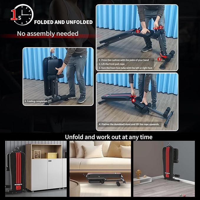 • 💪【 1 Second Quick Folding and Unfolding 】: The best feature of this dumbbell stool is its folding function, which can be completed within 1 second. When not in use, it can be easily folded up and placed in the corner. When exercising, it only takes 1 second to unfold. Pulling the rope upwards only takes one second to fold. Folding is simple, convenient, and easy to unfold.d to unfold. Pulling the rope upwards only takes one second to fold. Folding is simple, convenient, and easy to unfold.