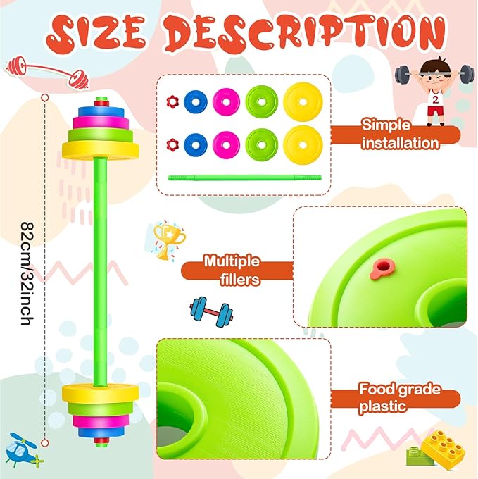 - Adjustable Weight: toddler exercise equipment comes with 8 weight plates that can be filled with sand or water, you can gradually increase the weight as your child grows, which can exercise your child's hand, eye, arm coordination and make him stronger and more powerful