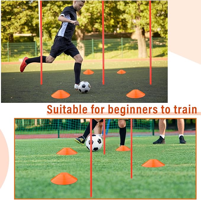 • Ample Quantity: this set includes 12 soccer training poles and 16 agility cones, providing enough equipment for a variety of training drills and exercises; With this set, athletes can create training programs that are tailored to their specific needs; The quantity makes it easy to set up multiple training stations, allowing for efficient use of time during training sessions; Whether you are an advanced athlete or a beginner, this set will help you improve your training goals in the short term