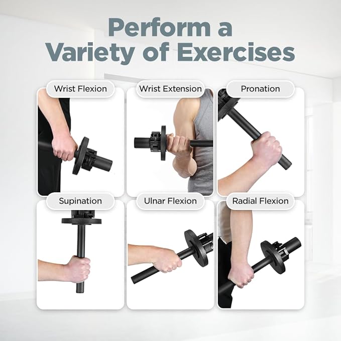 • Multi-Functional Workouts: Engage in wrist, core and full-body strength training by performing wrist flexion/extension, pronation/supination, ulnar/radial flexion, bent-over row, Romanian deadlift, wrist roll, squat clean and overhead press arm exercise equipment arm workout equipment.