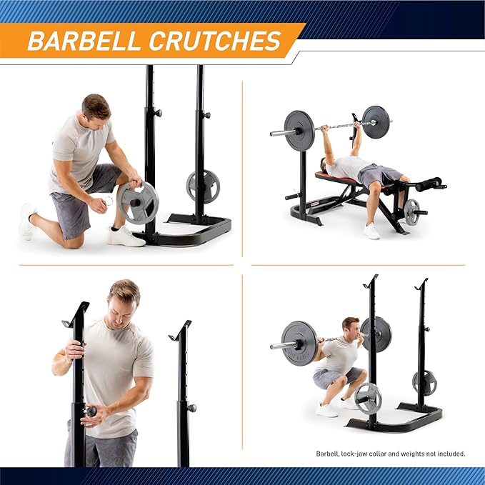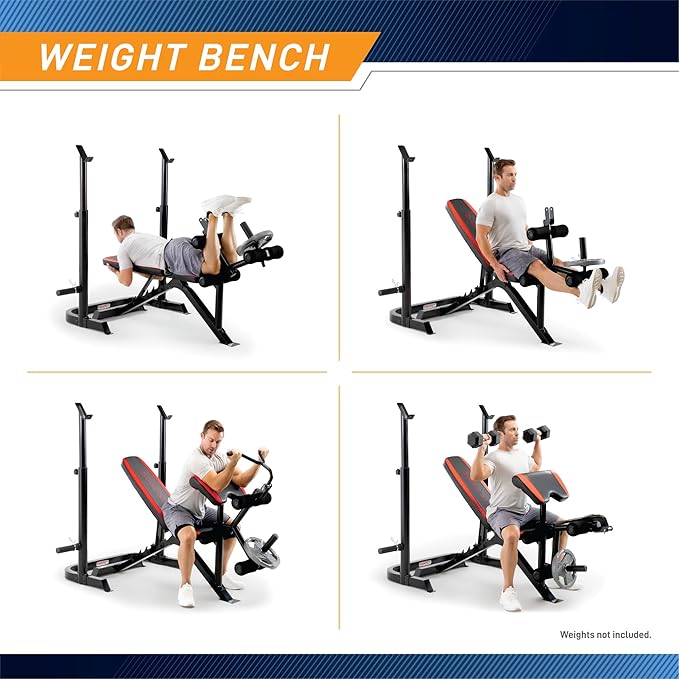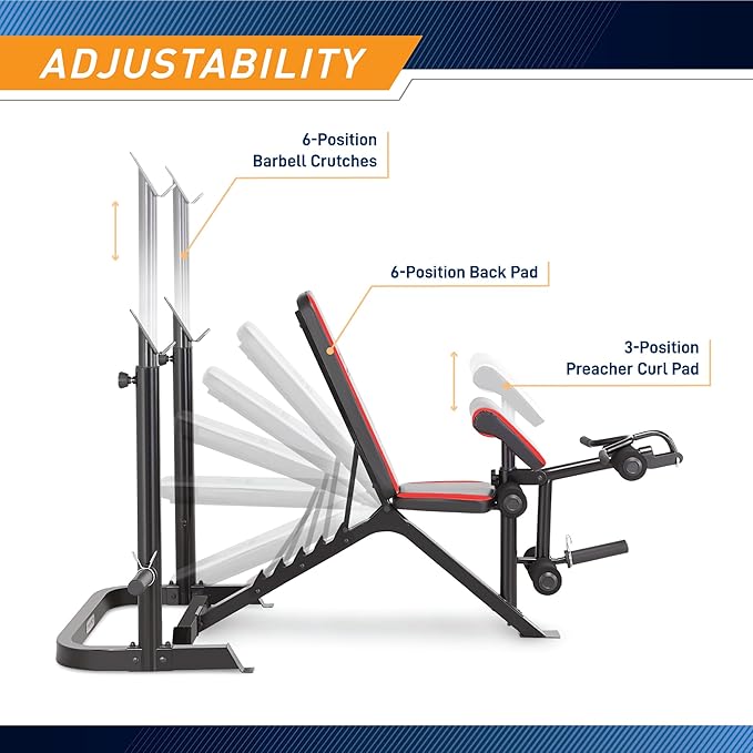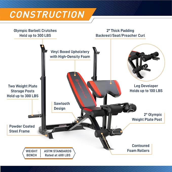 - ADJUSTABLE DESIGN – The Marcy Olympic Bench MKB-979 has an adjustable back pad and arm curl pad to accommodate incline, decline, and flat chest press exercises. You can also adjust the height of the barbell crutches for easier access.