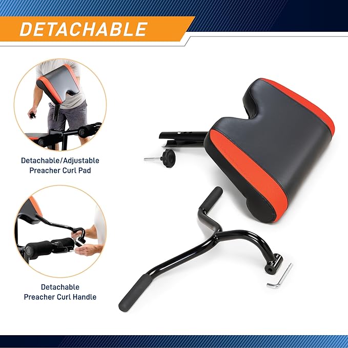 - EXTRA COMFORT – This workout bench has padded vinyl foam seats and backrest pad for long-lasting comfort when lifting and sitting down. The rubber grips on the arm curl handle offer you added control, even when you sweat.