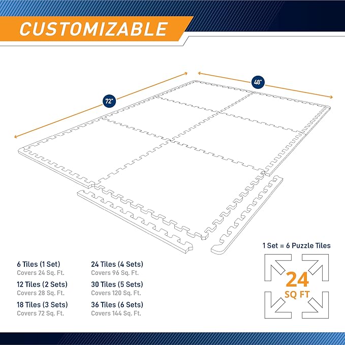 - INTERLOCKING COVERAGE MATS –This high-performing fitness mat comes with 6 tiles measuring 2 x 2 feet with interlocking edges for easy assembly. It can cover up to 24 square feet of floor space – making it the perfect workout and training accessory.
