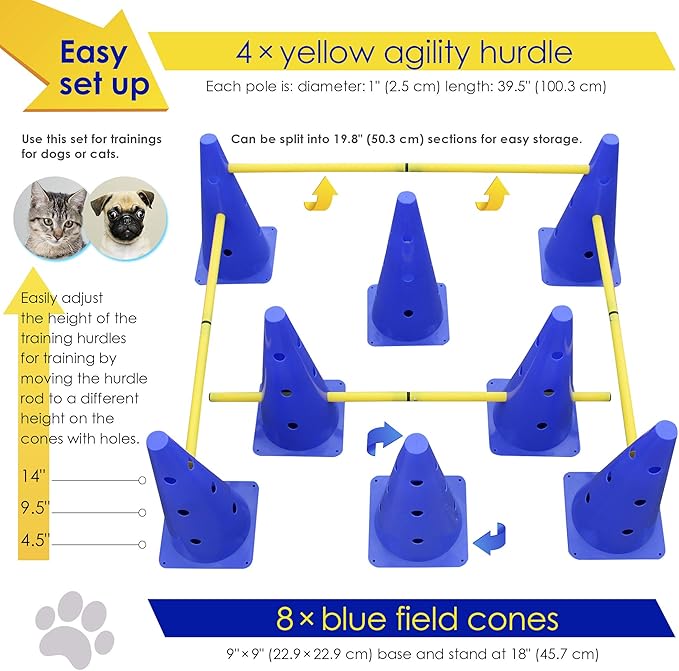 • [Convenient Storage] Each dog training set includes 8 blue practice cones, 4 yellow hurdle poles, and a large storage bag; Yellow poles split into 19.8-inch sections and cones stack to make transportation easier