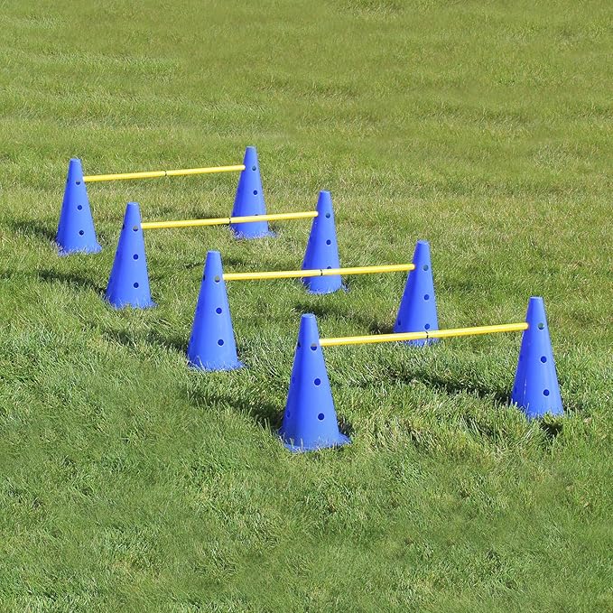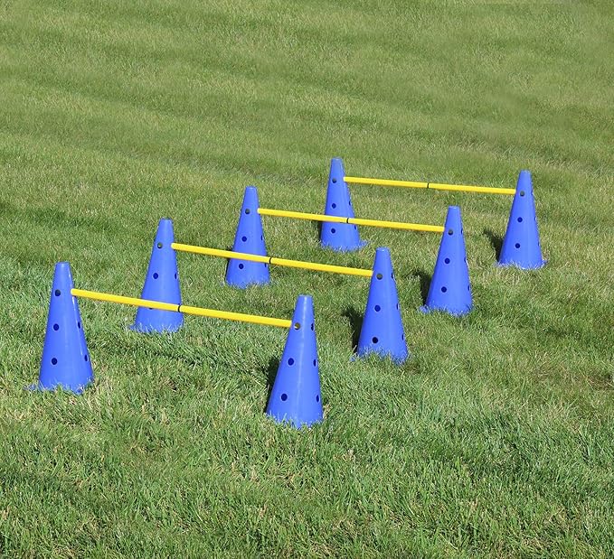• [Adjustable Hurdle Heights] Traffic cones features 3 hole heights to adjust the hurdle size; Easily adjust the height to 4.5 inches, 9.5 inches, or 14 inches off the ground by moving the hurdle rod to a different height on the cones with holes