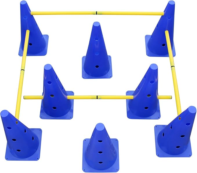 - [Convenient Storage] Each dog training set includes 8 blue practice cones, 4 yellow hurdle poles, and a large storage bag; Yellow poles split into 19.8-inch sections and cones stack to make transportation easier