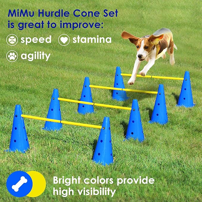 - [Cone and Hurdle Set] Increase your dog’s agility and speed with the MiMu Dog Agility Training Equipment - Athletic Training Cones and Exercise Hurdles; Bright colors provide high visibility to use these dog agility equipment cones and poles for physical therapy, recreational use, and fitness training