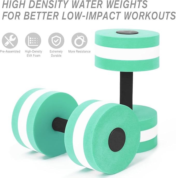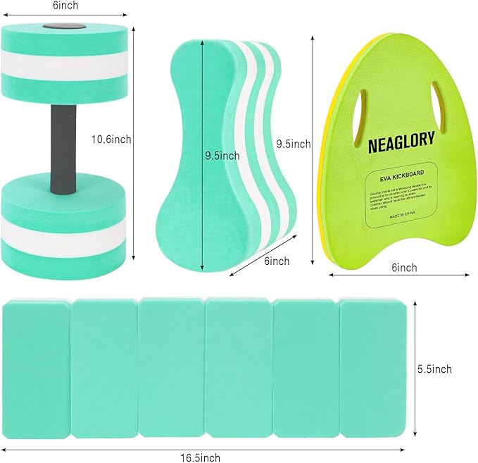 • Aquatic Exercise Equipment: This combo set has all the essential tools you need for aquatic exercise. It includes 2 high-density EVA foam water weights, 1 swimming belt, 1 swimming pull buoy, 1 swimming kickboard.