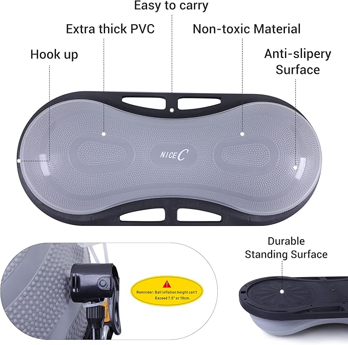 - NDUSTRIAL GRADE MATERIAL AND EASY INSTALLATION: Our Nice C balance trainer ball is made with durable rubber and sturdy, slip resistant ABS plastic. The base of the ball is made with an environmentally-friendly, non-toxic and chemical-free PVC material. Installation of the balance ball is very quick and easy. Just attach and step on the included foot pump to fill the ball. It inflates within a minute and deflates in seconds.