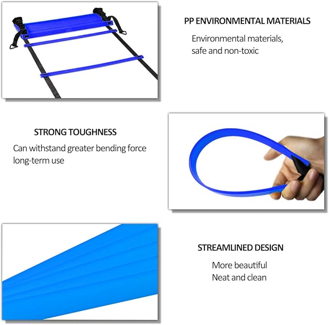 • 【AGILITY LADDER WITH FLEXIBLE DESIGN】This speed ladder crafted with high-quality PP material designed to last for years of use and training. It is flexible and adjustable, the space between rungs is adjustable up to 15" inch. You can simple adjust it in the nylon straps and secure it in place with rust-resistant metal pegs so as to meet your workout demands