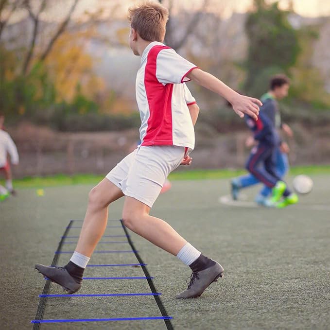- 【AGILITY LADDER WITH FLEXIBLE DESIGN】This speed ladder crafted with high-quality PP material designed to last for years of use and training. It is flexible and adjustable, the space between rungs is adjustable up to 15" inch. You can simple adjust it in the nylon straps and secure it in place with rust-resistant metal pegs so as to meet your workout demands