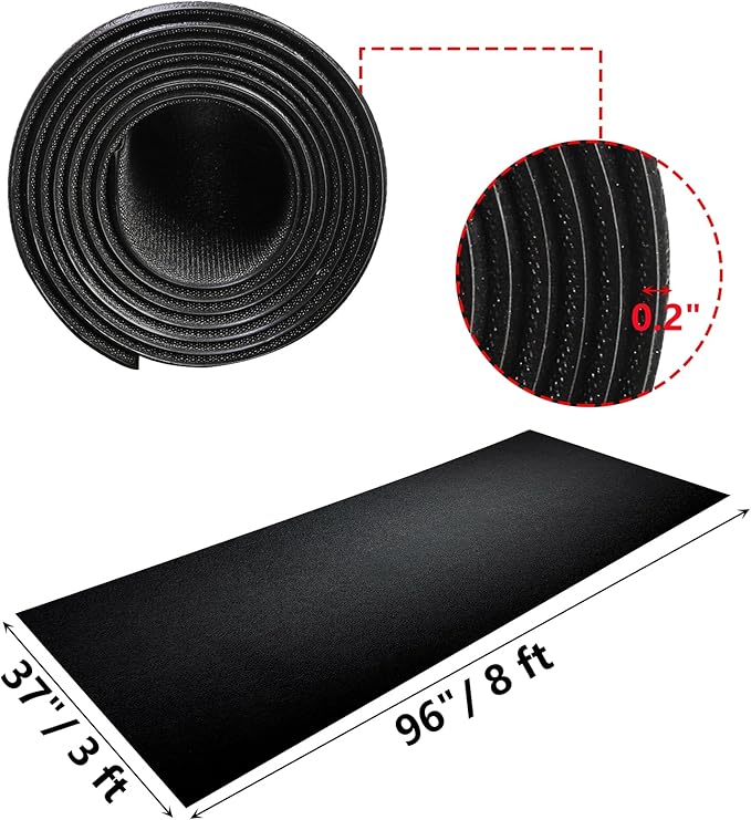 - Product Information: You will get a large exercise equipment mat measuring 96" x 37" (8 x 3 ft) with a thickness of 0.2". Rolls up easily for storage. It is recommended to measure the size of the equipment first to ensure that our products meet your needs.