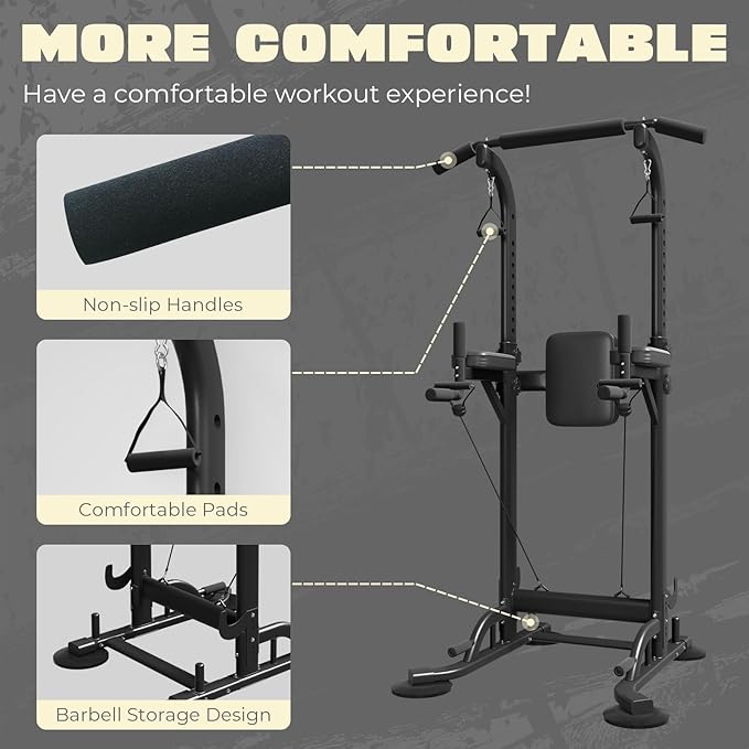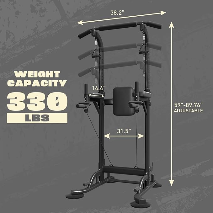 - STURDY AND DURABLE:Featuring a heavy-duty steel frame with a scratch-resistant coating, this power tower dip station can hold up to 330 pounds. Extended foot pads are designed to extend the force area for more stability in your power tower. Vacuum pads protect your floors, and the dip bars provide a solid stand during training.
