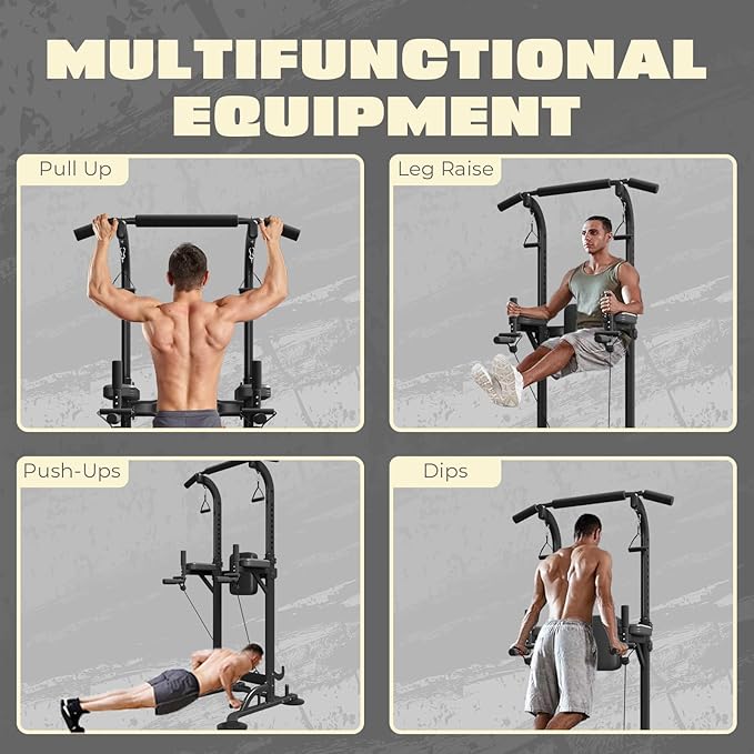 - MULTIFUNCTIONAL DESIGN: It is a multi-functional pull up stand home gym that supports pull-ups, vertical knee raises, dips as well as leg stretches, which helps to train the back, arms, shoulders, abdominal, chest and resistance bands to make the upper body stronger, keep you energized, relieve fatigue, and prevent muscle strain, cervical spondylosis and so on.
