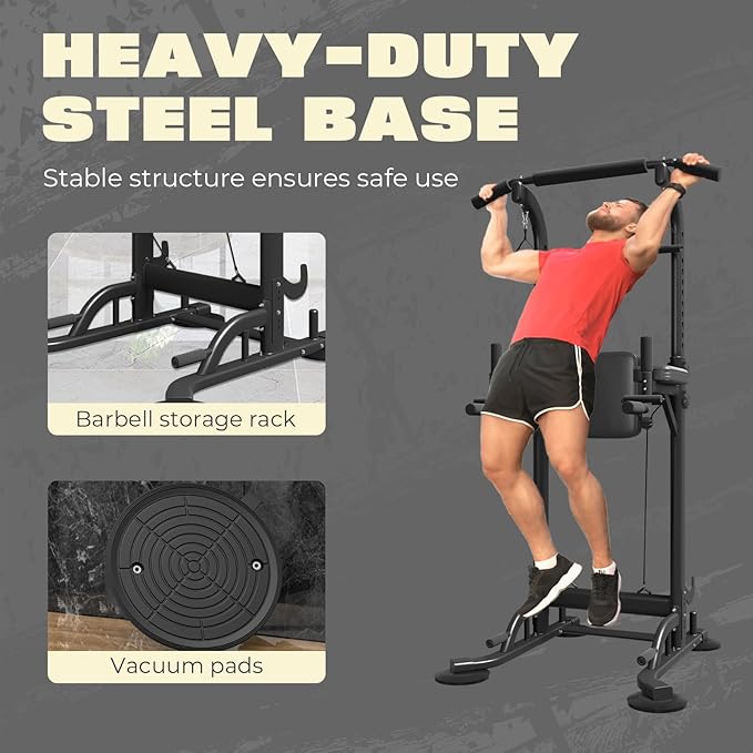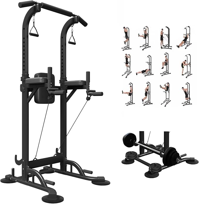 - STURDY AND DURABLE:Featuring a heavy-duty steel frame with a scratch-resistant coating, this power tower dip station can hold up to 330 pounds. Extended foot pads are designed to extend the force area for more stability in your power tower. Vacuum pads protect your floors, and the dip bars provide a solid stand during training.