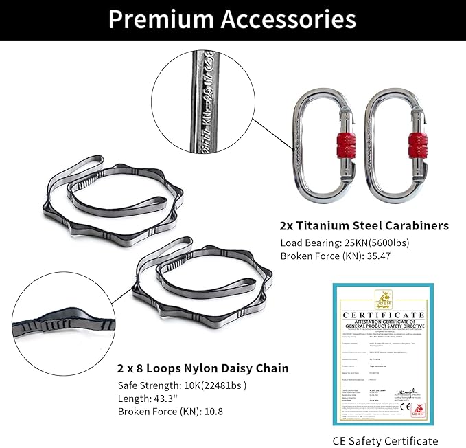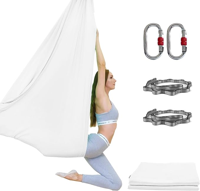 - Complete Arial Yoga Set- Our yoga trapeze swing comes with everything you need to get started, including 2* 25KN steel screw-lock carabiners, 2* polyester daisy chains, 1* yoga cloth(5.5 yards x 3 yards), 1* instruction manual