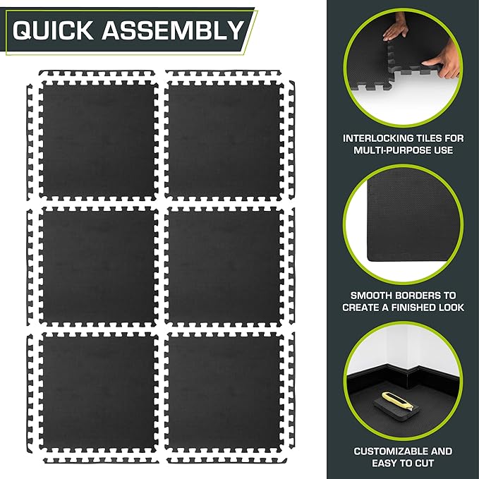 - COVERS 24 SQ. FT. - Each tile measures 24” x 24” x 3/4”-thick or 24" x 24" x 1"-thick Includes 6 tiles and 12 end borders for a polished look