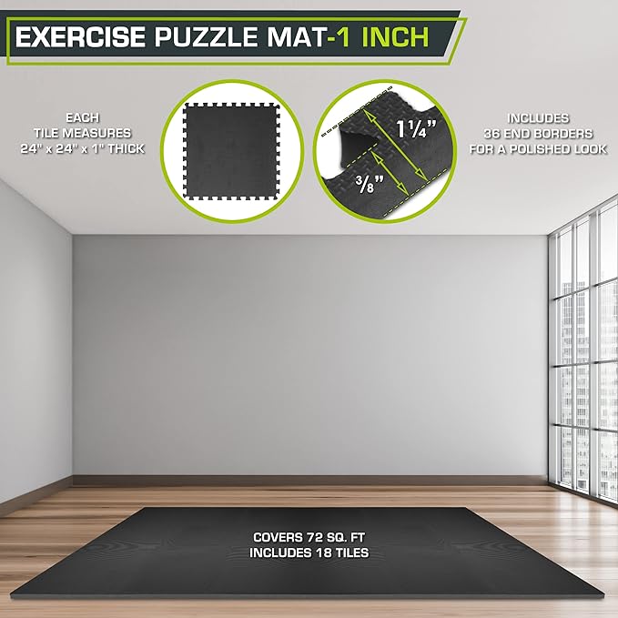 • DIFFERENT LEVELS OF COVERAGE - Each tile measures 24”x24”x3/4” or 24"x24"x1"; 2 sets are available for each thickness. The ¾"offers pack of 6 tiles (24 SQ Ft) or 24 tiles (96 SQ FT) and the 1" offers pack of 6 tiles (24 SQ Ft) or 18 tiles (72 SQ Ft)
