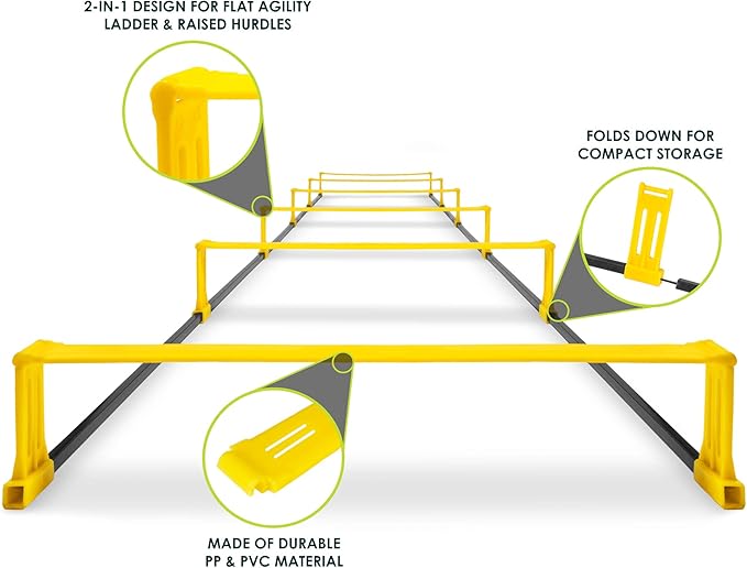 • 2-IN-1 LADDER -- The versatile design allows you to train on a flat agility ladder or a raised speed ladder. The 3.5” raised rungs add more of challenge for a more intense workout. Easily fold up rungs to hurdles are fully collapsible for easy storage.