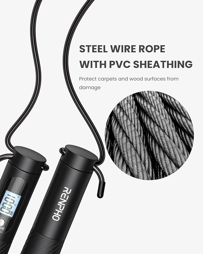 - 【LCD display & non-slip handle】RENPHO jump rope with counter equips silicone non-slip handle that is made from friendly environmental silicone material, offer you comfortable touch and non-slip when exercising. Also, the main handle is embedded with a backlit LCD display that provides users a clear view of the rope skipping data.