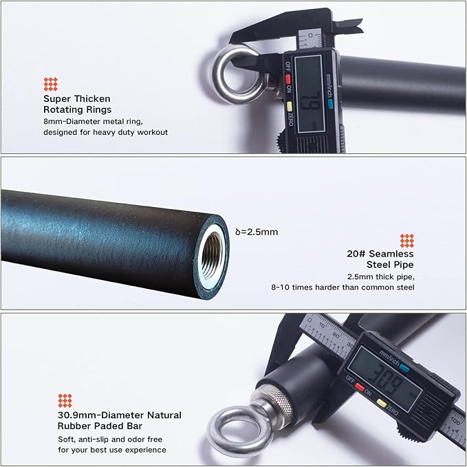 - ★THICKER & LONGER BAR: The steel pipe is made of 5mm super thicken metal material, max load up to 850 lbs and hard to be bent, damaged or out of shape. It is the longest bar of the whole market makes the bar more comfortable and compatible for more exercises such as squat, weight lift and seated row.