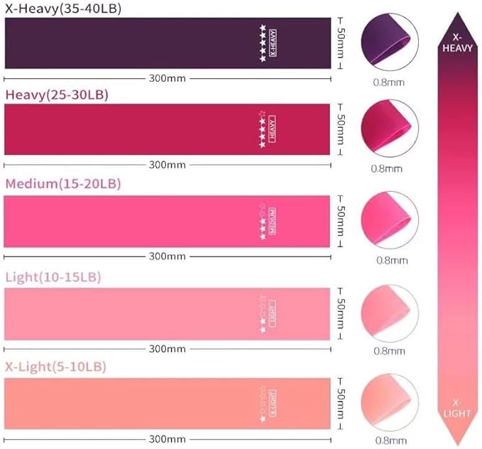 - 12"³ By 2"³ Heavy Duty Loop Resistance Bands Come In 5 Varying Resistance Levels. Perfect Whether You Are Just Starting To Workout Or A Gym Rat. Our Extra Light And Light Bands Are Great For Beginners, While Our Medium, Heavy And Extra Heavy Exercise Bands Are Targeted For More Intermediate And Advanced Strength Training.