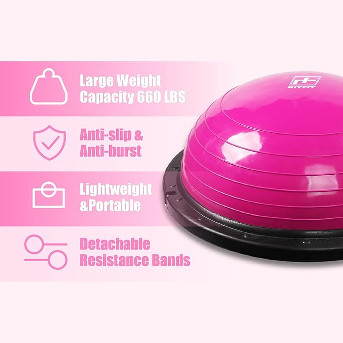 - BALANCE BALL TRAINER: RitFit balance half ball is constructed of durable rubber and sturdy, ABS plastic which is anti-slip.The trainer dome side up provides an ever-changing, unstable, dynamic surface while the device itself remains stable. Environmental-friendly PVC material brings non-toxic, chemical-free using experiences. And it’s easy to store. Large weight capacity:660lbs.