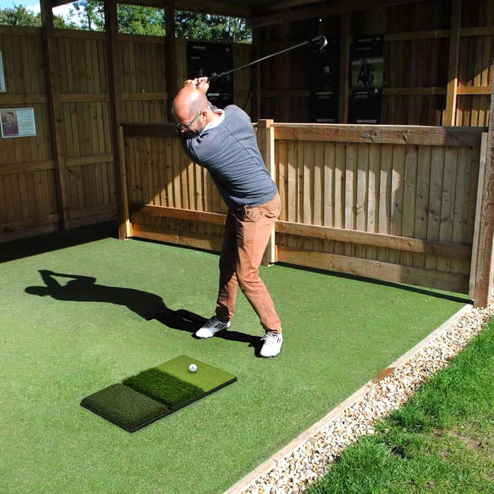 - PRACTICE DIFFERENT LIES: 30'' x 15'' golf mat has three distinct sections to practice from all types of lies from fairway to rough. High-density tee turf so you can tee up drivers and fairway woods like you're on the driving range