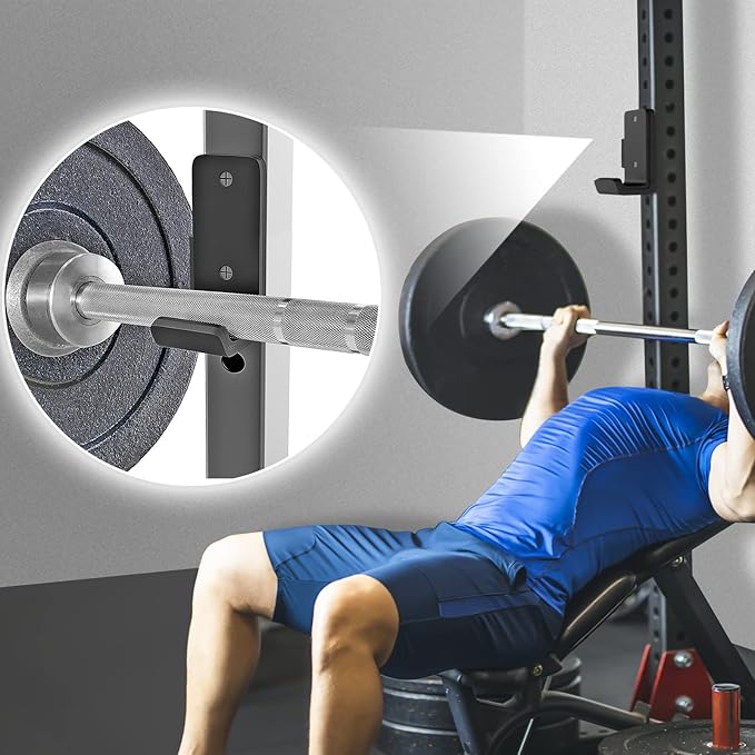 - 【Strong and safe】The J-hooks barbell holder is made of 0.3" thick solid steel and the hooks add a thick plastic protection layer for reducing noise during your workout session and protect your barbell from damage, can support to 1000lbs each hook.