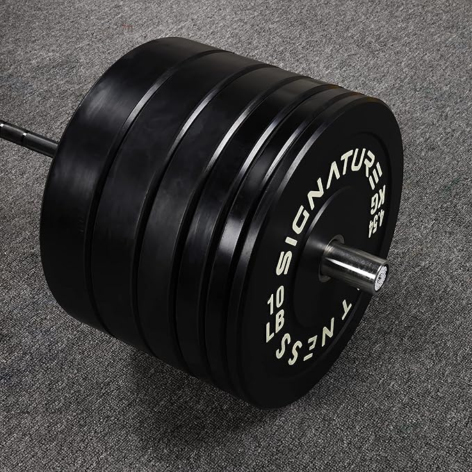 - 🌟 100% VIRGIN RUBBER - LOW ODOR AND BOUNCE 🌟 - Signature Fitness Bumper Plates contain NO recycled rubber. This means low to no odor, guaranteed durability, and low "dead" bounce for safety.