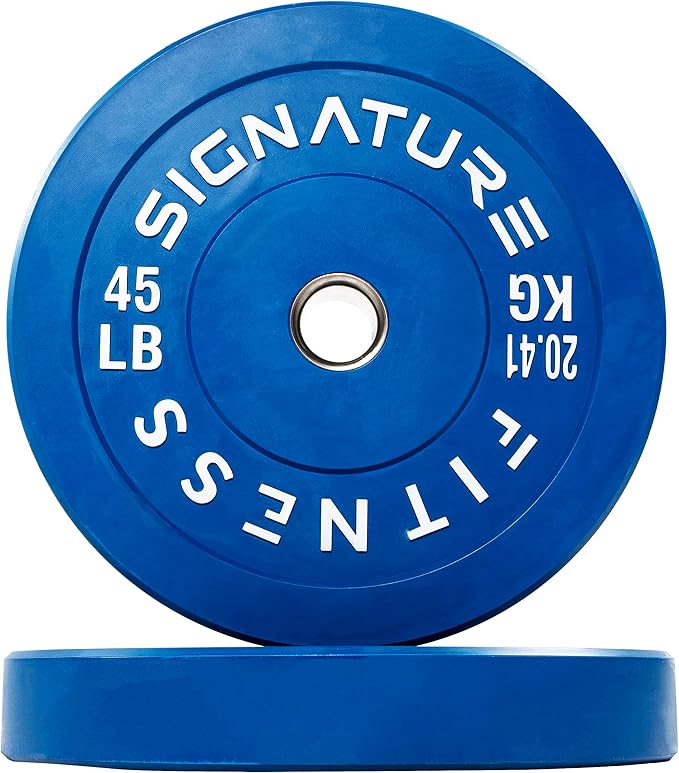 • 🌟 100% VIRGIN RUBBER - LOW ODOR AND BOUNCE 🌟 - Signature Fitness Bumper Plates contain NO recycled rubber. This means low to no odor, guaranteed durability, and low "dead" bounce for safety.