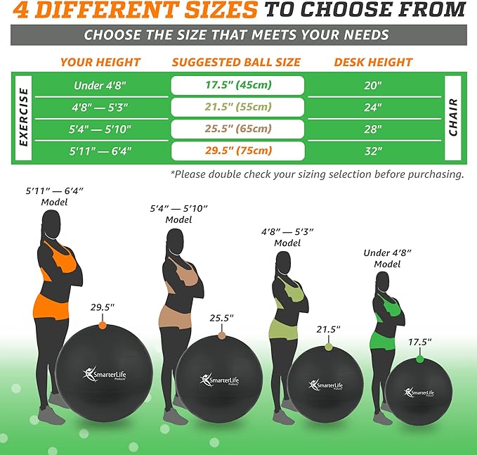 - THE RIGHT SIZE FOR YOU: We offer a choice of 45 cm, 55 cm, 65 cm, and 75 cm sizes to suit your height so that you can easily and conveniently find the correctly sized work out ball to sit on or exercise with. Our sizing chart uses the user’s height to help you select the correct size for workouts and uses desk height to help you select for use as a chair.